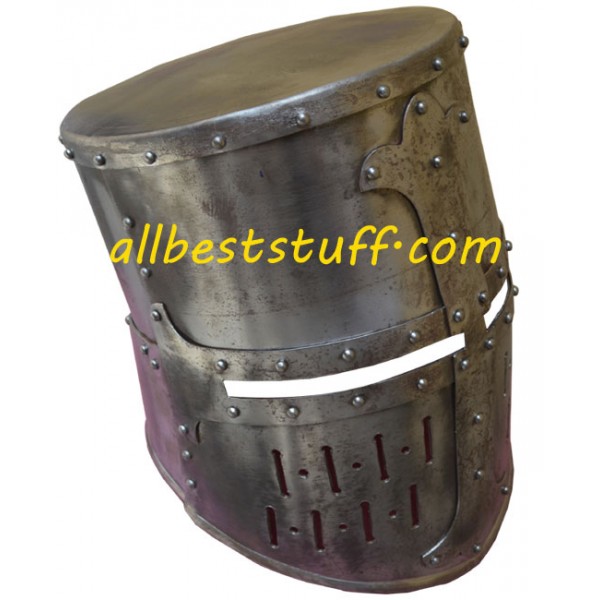 In its simplest form, the great helm was a flat-topped cylinder of steel that completely covered the head and had only very small openings for the eyes and mouth. The Crusader Great Helm developed in the 13th century. The great helm offeres vastly superior protection than some of the previous helmets, such as the nasal helm and spangenhelm. The great helm is today especially popular amongst live-action role players and in medieval re-enactment such as the (SCA) Society for Creative Anachronism.