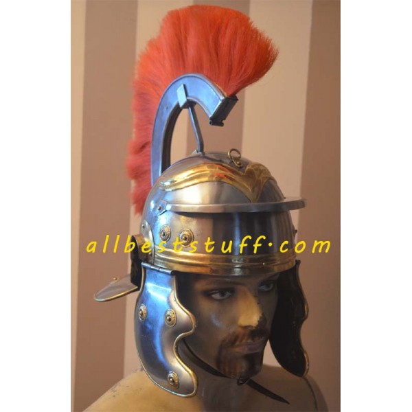 A very popular Roman Centurion Helmet. This Roman Centurion Helmet features a red horse hair plume and is hand made of high carbon steel. The Roman Centurion Helmet is fully wearable.